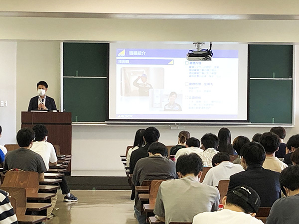本学3年生を対象に、県内企業を知るための研究の一環として企業講師をお招きし、業界研究と称して講義を行っていただきました。実際に仕事をされている方から働いている中で気が付いたことや仕事内容、または地域とのかかわり方など、現場でしか知り得ない貴重なお話を聞かせていただきました。また、企業で活躍している本学卒業生からも、自身の就職活動や仕事でのやりがいなどをお話ししていただき、これから本格的に就職活動への準備がはじまる3年生にとって、とても有意義な時間となりました。