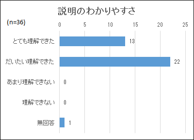 全体会についてのアンケート結果からは、「とても理解できた」や「だいたい理解できた」との回答が97.2%で、本学の説明について保護者の皆様に理解を深めていただけたようです。