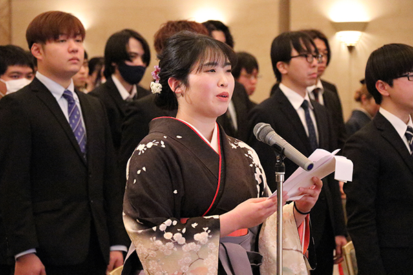 続いて卒業生を代表して早川寧音さんが、『大学生活では、自ら考え、選択し、行動することが求められましたが、その反面、行動に責任感を持つことや人生について真剣に向き合う時間を得たことで自己の大きな成長に繋がりました。この長岡大学で過ごした四年間は、私たちに素晴らしい出会いと実りのある時間を授けてくれました。卒業を迎えた私たちは、これからそれぞれが選んだ道を歩んでいくことになります。この大学生活で得たものを今後の人生に活かし、それぞれの形で社会に貢献できるよう未来へ羽ばたいていきたいと思います。』と答辞を述べました。