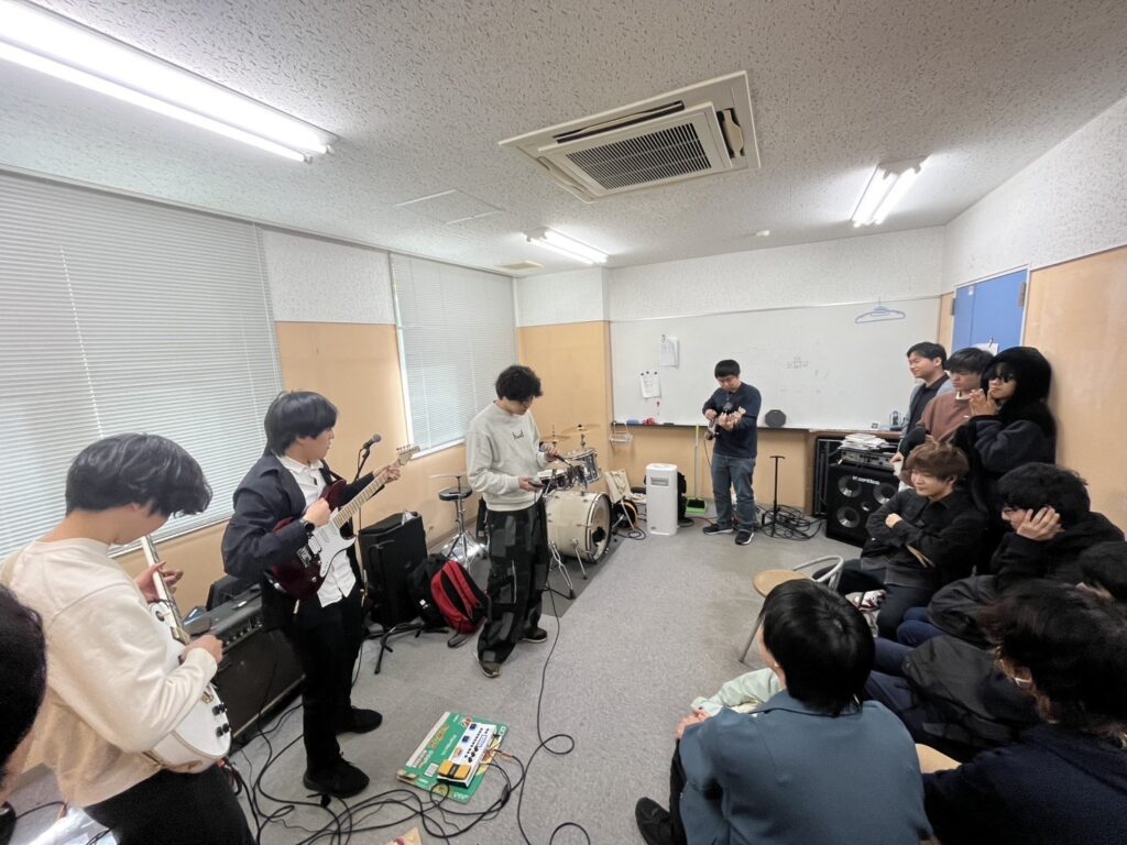 こんにちは!軽音楽サークルです。2025年4月30日(水)に、長岡大学3号館部室1にて、2年生バンドが初の学内ミニライブを行いました。演奏した曲は、KANA-BOONのシルエットです。今回演奏した2年生バンドのメンバーは、全員大学に入ってから楽器を始めた初心者です。バンドを結成してから初めてのライブでしたが、終始とても楽しそうに演奏してくれました。