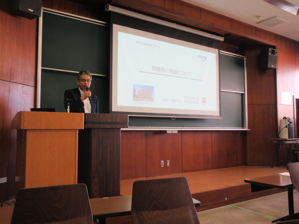 財務省関東財務局新潟財務事務所様による寄附講義「暮らしと行政」(担当教員:石川英樹)が今年度も始まりました。この講義は、新潟財務事務所様を含む、15の公的機関が本学に講師を派遣し、各回の講義をリレー方式でご担当していただき、学生に各機関の役割や行政の仕組みと主要施策を理解してもらうことを目的とした内容になっています。