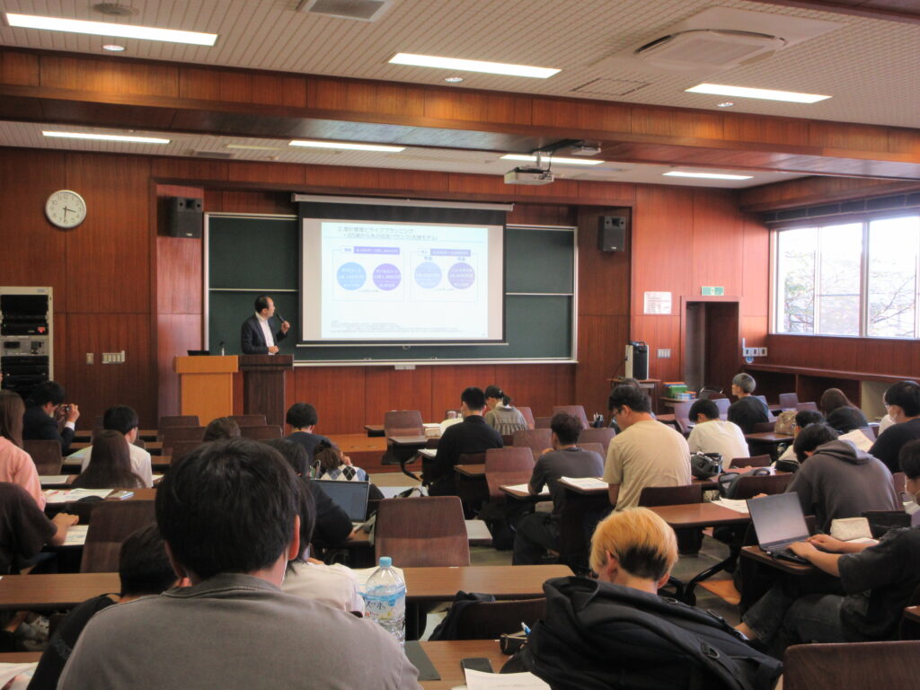 武藤様より「財務局の業務について」というテーマでお話しいただき、財務局が地域社会と財務省・金融庁をつなぐ重要な役割を担っていること、財政・金融・国有財産など多岐にわたる業務が地域社会の暮らしに密接にかかわっていることに驚きと関心を持って学生たちは聞いていました。