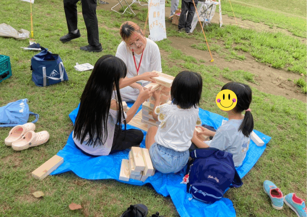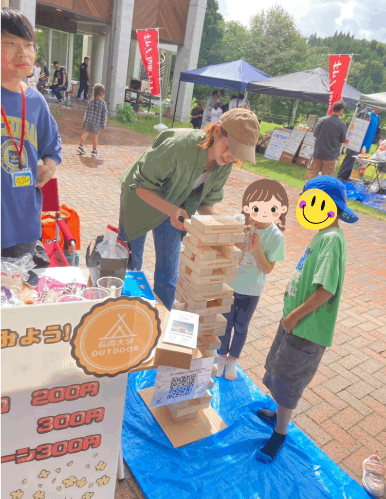 また、土曜日は晴れていたため風に強いバドミントンの体験も行いました。ジェンガとバトミントンは子どもに人気があり、親子でやることもあれば、学生と一緒に行うこともありました。