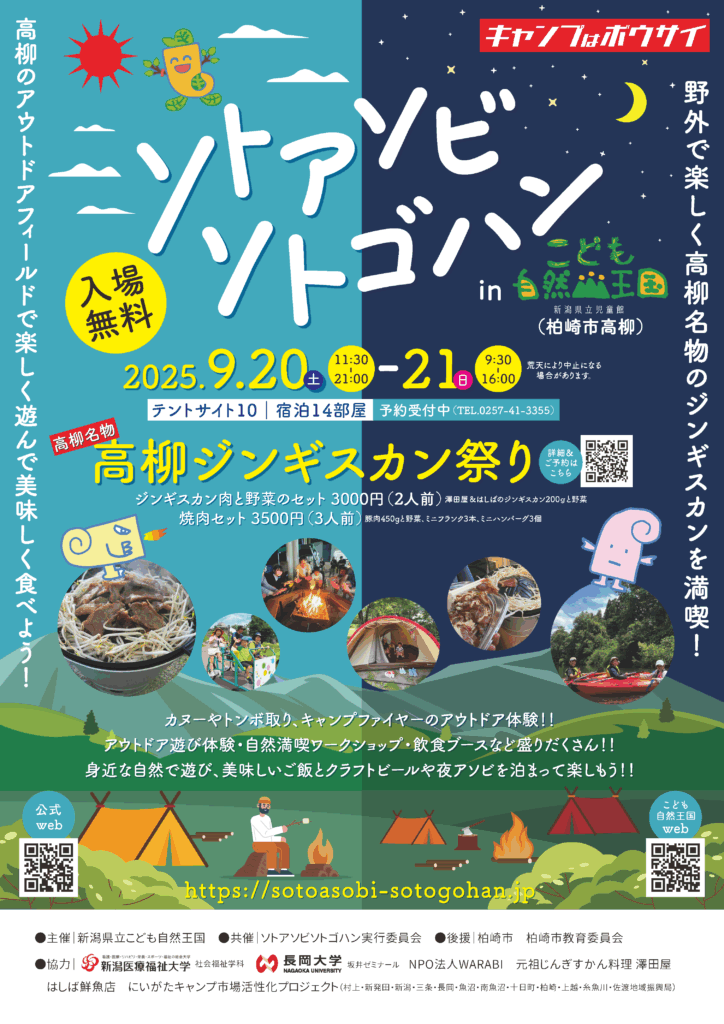 キャンプ・アウトドアの楽しさを知ってもらい、アウトドアに興味・関心を持つユーザを増やし、その結果新潟県内のアウトドアメーカーや地元の企業・商店の売り上げが増えることで地域経済がより成長するため、まずはアウトドアに興味を持ってもらおうと、9月20日(土)、21日(日)の両日 柏崎市高柳町にある 新潟県立こども自然王国 で開催された「ソトアソビ・ソトゴハン in こども自然王国」に2つの出展を行いました。