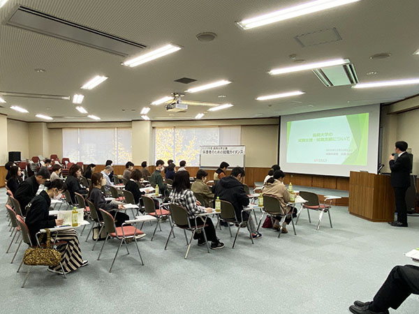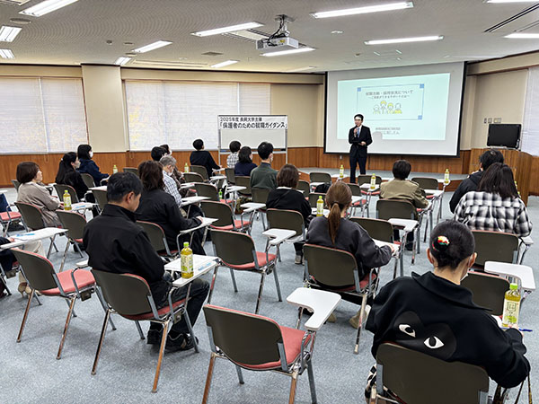 この度本学では、学生の就職活動を支援する一環として、保護者の皆様を対象とした「就職ガイダンス」を開催しました。近年の就職活動は、保護者の皆様が経験された時代とは大きく様変わりしていることから、最新の就職活動の動向や企業の採用傾向、大学の支援体制などを詳しく紹介させていただくとともに、保護者の皆様が果たす役割についても詳しくお話いたしました。