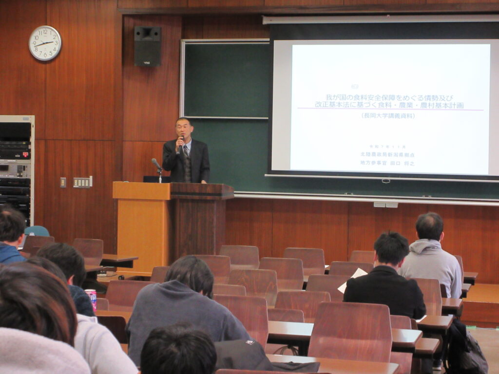 第1部として、農林水産省 北陸農政局 新潟県拠点 地方参事官 田口 将之様から「我が国の食料安全保障をめぐる情勢及び改正基本法に基づく食料・農業・農村基本計画」というテーマでご講義をいただきました。