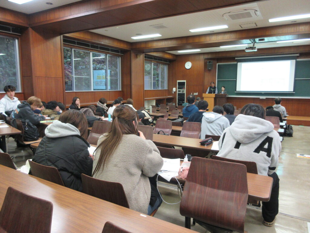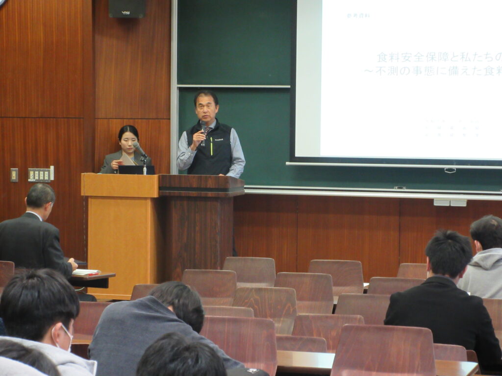 長期的な食料自給率とその要因などをお話しいただき、「食料問題は自分には関係ないと思っていたが、日常の選択が安全保障につながると知った」といった声が学生から寄せられました。
