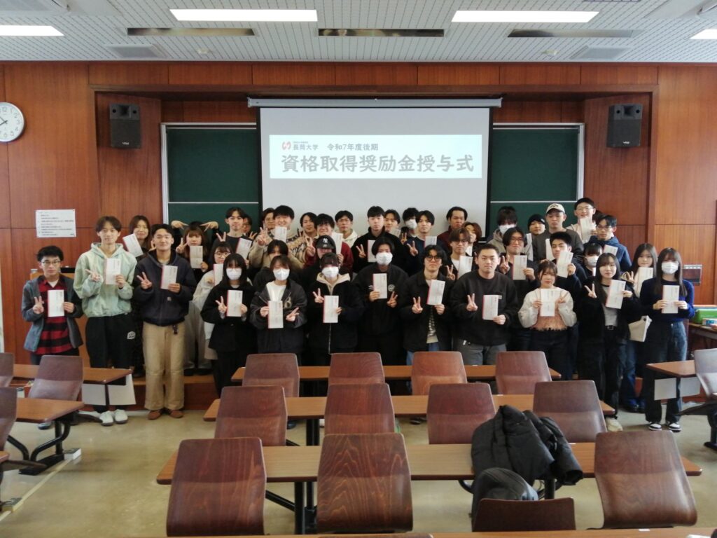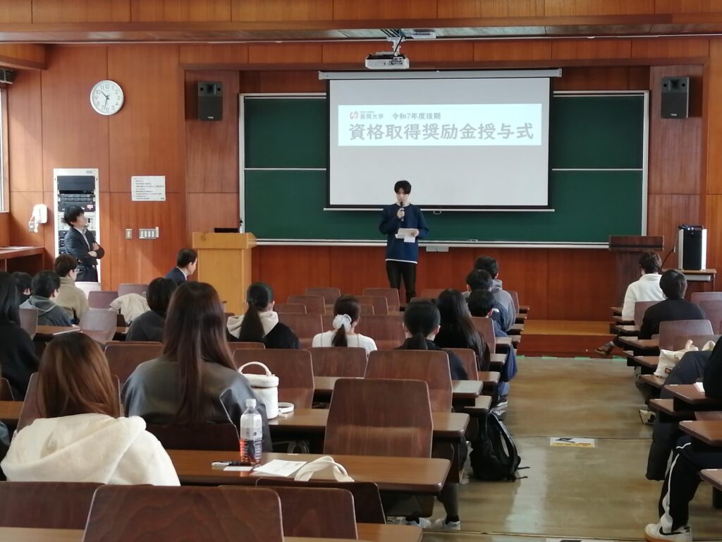 資格検定試験にチャレンジし、スキルアップ、キャリアアップを目指す学生をサポートするため、本学が指定する資格検定試験に合格した学生に資格取得奨励金を授与しています。令和7年度後期資格取得奨励金では66名から99件の申請があり、3月5日(木)に行われた資格取得奨励金授与式にて村山学長から奨励金が授与されました。