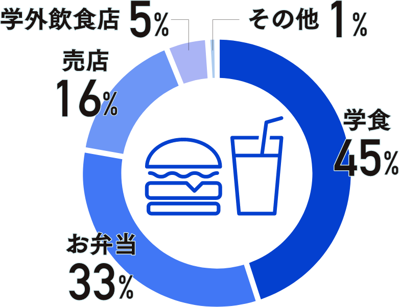 - 学食にはお弁当も持ち込めるので、学食で注文する人もお弁当の人もみんな一緒にランチができる。